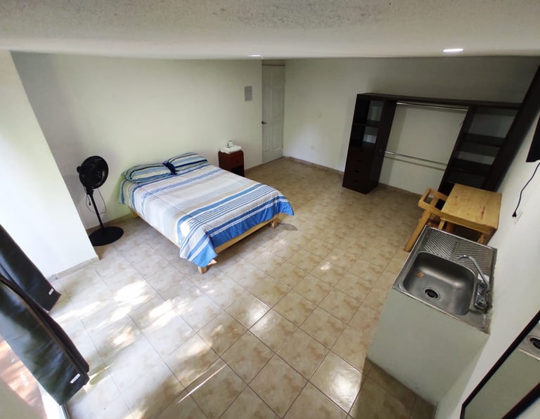 Amplia habitación con baño en su interior, TV Roku y vista al jardín. Ocupación máxima 3 personas.
